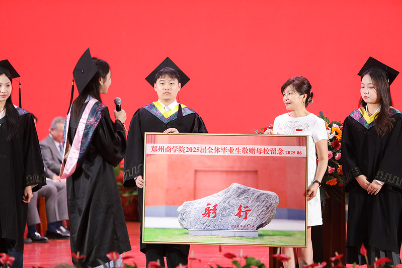 临别之际,2025届毕业生为母校送上“躬行石刻”,作为留给母校的珍贵纪念品,向郑商表达深深的眷恋和美好祝福。王育华董事长代表学校接受纪念品并合影留念,现场洋溢着浓浓的感恩之情。
