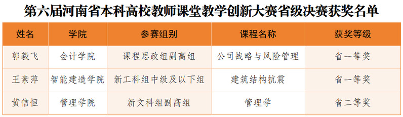 5月24日—25日,第六届河南省本科高校教师课堂教学创新大赛暨第五届全国高校教师教学创新大赛(河南赛区)选拔赛省级决赛在河南大学举行,我校会计学院郭毅飞老师、智能建造学院王素萍老师、管理学院黄信恒老师在该次赛事中,从全省近500名参赛教师中脱颖而出,取得了优异的成绩,具体获奖情况如下: