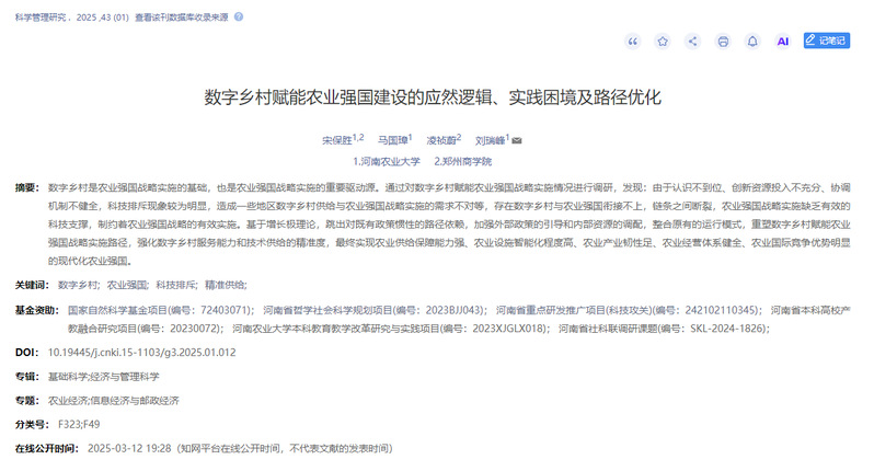 近日,我校会计学院教师宋保胜教授,以第一作者在《科学管理研究》(CSSCI收录)发表了题为《数字乡村赋能农业强国建设的应然逻辑、实践困境及路径优化》的论文,讨论了如何进一步加快推进数字乡村建设,全面赋能农业强国战略实施。