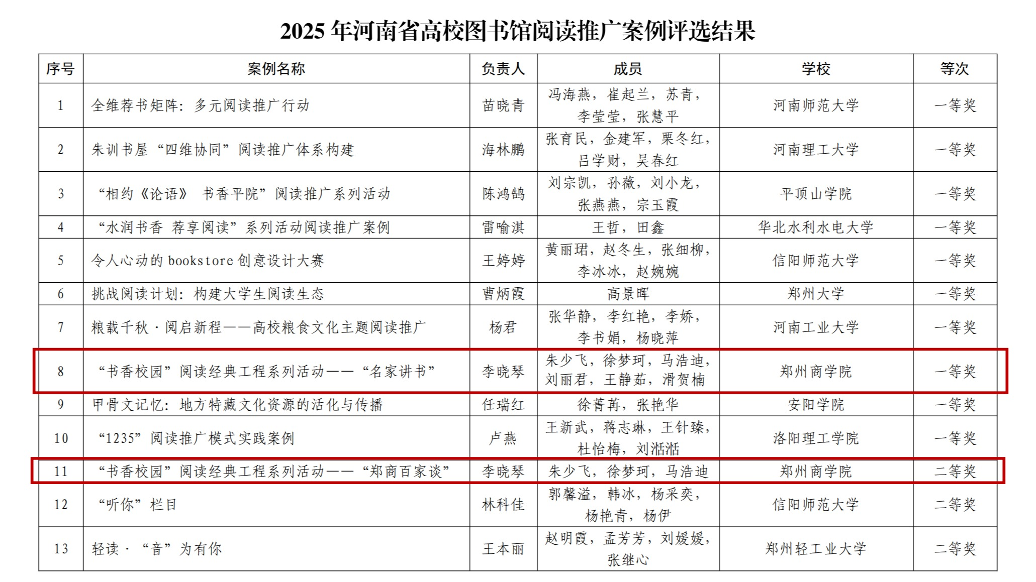 河南省高等学校图书情报工作委员会近日公布2025年度阅读推广案例评选结果,我校选送的“名家讲书”项目荣获一等奖,“郑商百家谈”项目获得二等奖。