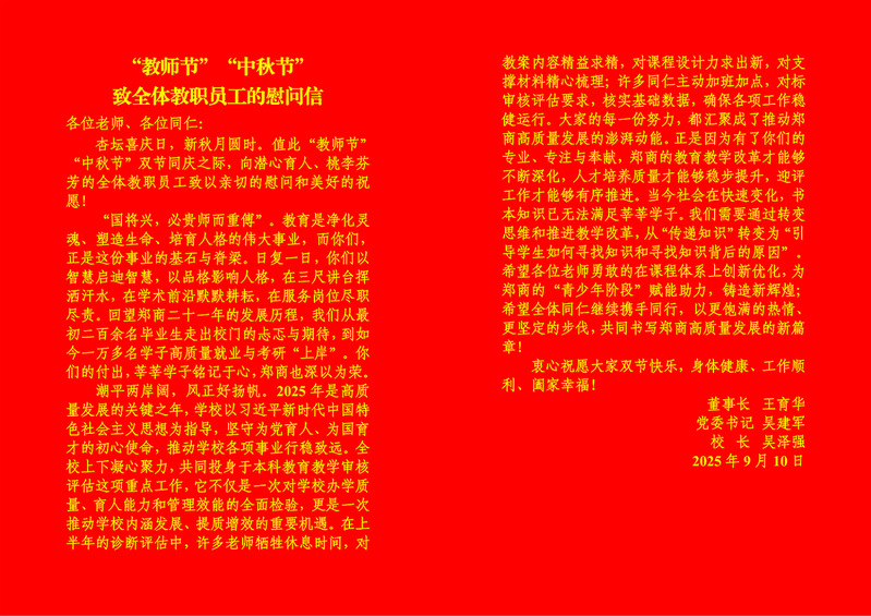 在第41个教师节之际,为深入贯彻落实河南省教育厅《关于做好庆祝第41个教师节有关工作的通知》要求,围绕“以教育家精神铸魂强师,谱写教育强国建设华章”主题,学校坚持以教师为主体,精心策划并组织系列庆祝活动,向辛勤耕耘在教育教学一线的全体教职工致以节日的问候与崇高的敬意。