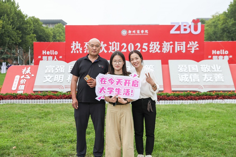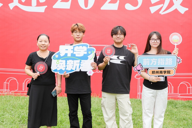 学校中心广场上,“热烈欢迎2025级新同学”“郑商人”“郑青春”的巨型喷绘格外醒目;“在郑商成为更好的自己”“爱在郑商”“我是郑商人”等温馨标语,满是巧思与热情;创意合影墙新颖有趣,不少新生与家人挚友驻足打卡,“咔咔咔”的快门声成了迎新日最轻快的背景音乐。来自安阳的新生张靖然与家人一起,在迎新背景墙前笑容灿烂地定格下成为“郑商人”的珍贵瞬间。“学校的迎新氛围太棒了,这张照片为我们全家留下了特别有意义的纪念。”她开心地说。精美的签名打卡墙是迎新日的“人气地标”,人流络绎不绝,它是新生与郑商初次相遇的满满仪式感,同学们手握特制的签名笔,在墙面上庄重地写下自己的名字,每一个名字,都是青春画卷上独一无二的落款,宣告着“我,已正式成为郑商人!”
