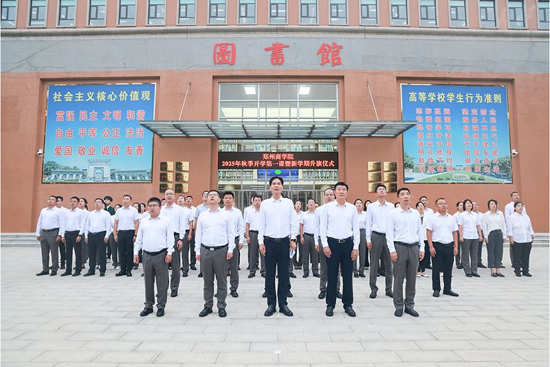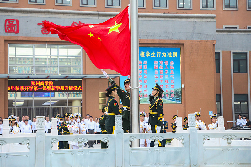 矢志报国勇担当,奋斗筑梦新时代。开学第一课暨升旗仪式是我校开展爱国主义教育的重要载体,旨在引导广大师生坚定理想信念、明确奋进方向,助力新生尽快融入集体,以昂扬姿态开启新学期。新学期孕育新希望,新起点呼唤新作为,全体郑商人将坚定理想信念,厚植家国情怀,锚定奋斗目标,淬炼向上品格,为实现中华民族伟大复兴而不懈奋斗。