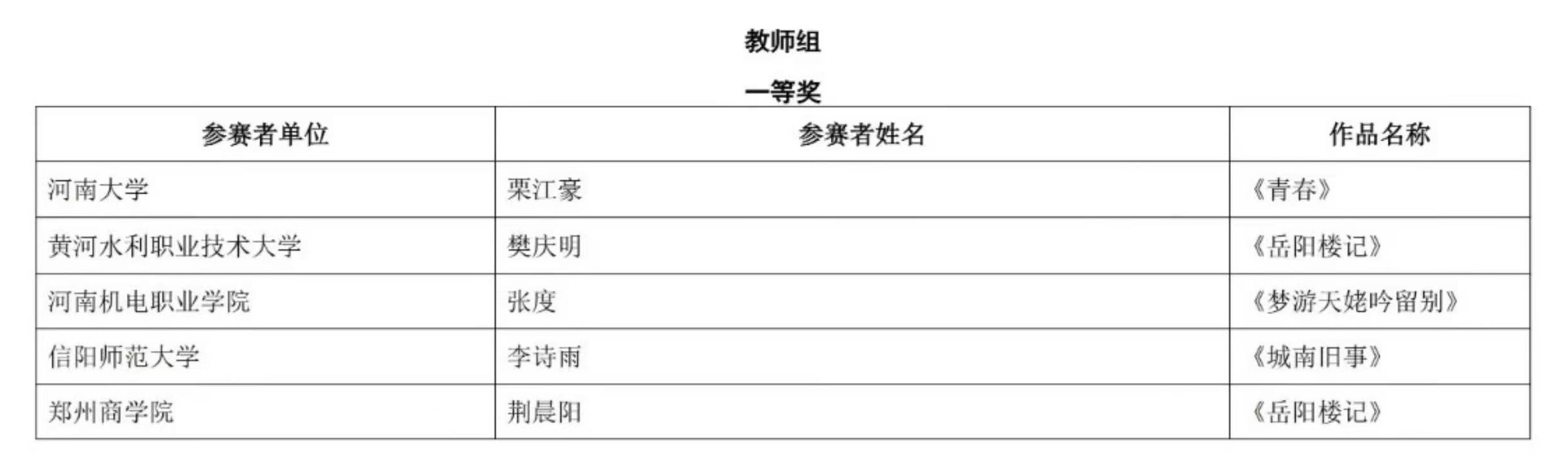 其中,荆晨阳老师参赛的作品《岳阳楼记》在教师组比赛中荣获一等奖。由张娇娇、许明月老师指导,庾佳、段洁琼、潘彩艳、刘少丽、张佳豪同学参赛的作品《请党放心,强国有我》和由张寅韬、刘洋老师指导,曹亚琳、李思雨、李嘉妮、沈佳瑶、马一鸣同学参赛的作品《诗颂芳华》荣获大学生组三等奖。