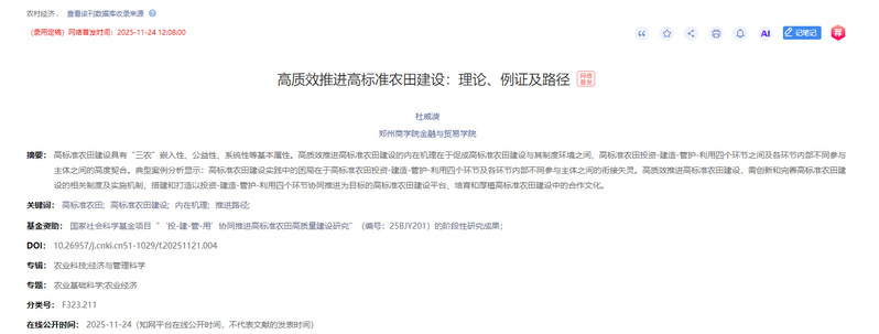 11月24日,我校金贸学院杜威漩教授的独著论文《高质效推进高标准农田建设:理论、例证及路径》在高水平核心期刊《农村经济》网络首发。 该论文是杜教授主持的国家社会科学基金项目“投-建-管-用 协同推进高标准农田高质量建设研究”(编号:25BJY201)的阶段性研究成果。论文聚焦于高标准农田建设这一新时代保障国家粮食安全、推动农业现代化发展的关键基础领域。