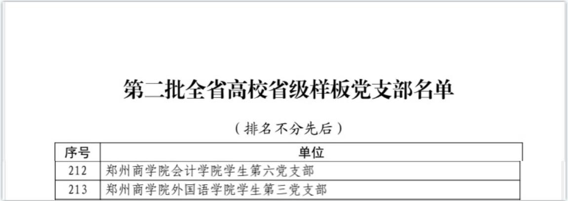 近日,中共河南省委教育工委公布了第二批全省高校省级样板党支部评选结果,我校会计学院学生第六党支部、外国语学院学生第三党支部获评“第二批全省高校省级样板党支部”,这标志着我校基层党建工作取得新突破、迈上新台阶,充分展现了我校基层党组织标准化规范化建设取得的扎实成果。