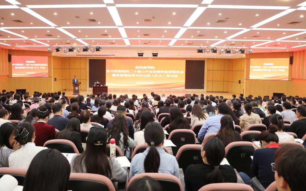 10月10日下午,我校在图书馆一楼学术报告厅举行学习宣传贯彻党的二十届三中全会精神宣讲报告会暨党委理论学习中心组(扩大)学习会。学习贯彻党的二十届三中全会精神省委教育工委宣讲团成员、郑州大学学术副校长、马克思主义学院院长、博士生导师刘吕红教授以“紧扣中国式现代化主题 落实进一步全面深化改革重大举措”为题作宣讲报告。党委书记吴建军、党委副书记兼纪委书记裴晓涛、校长助理泥川出席会议,校党委理论学习中心组成员、科级以上干部、全体辅导员和师生党员代表400余人参加学习。宣讲会由党委副书记兼纪委书记裴晓涛主持。