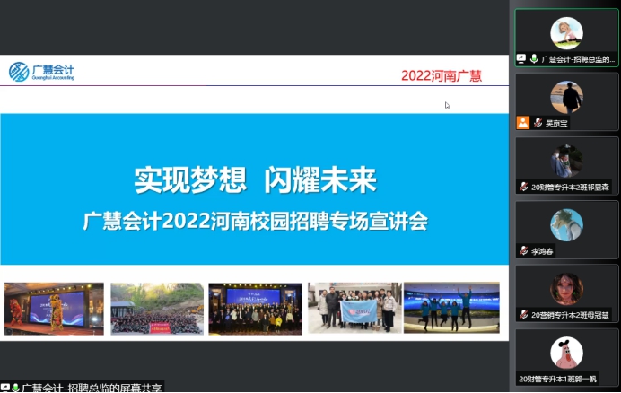 2022年3月3日上午9点,广慧会计携手999策略白菜手机论坛—工商学院共同举办的毕业实习(集中)宣讲会--广慧会计专场招聘会以线上宣讲形式准时厅顺利召开。有关毕业实习指导老师,参会企业广慧会计招聘代表,我校2022届毕业生共同参加了本次线上宣讲。