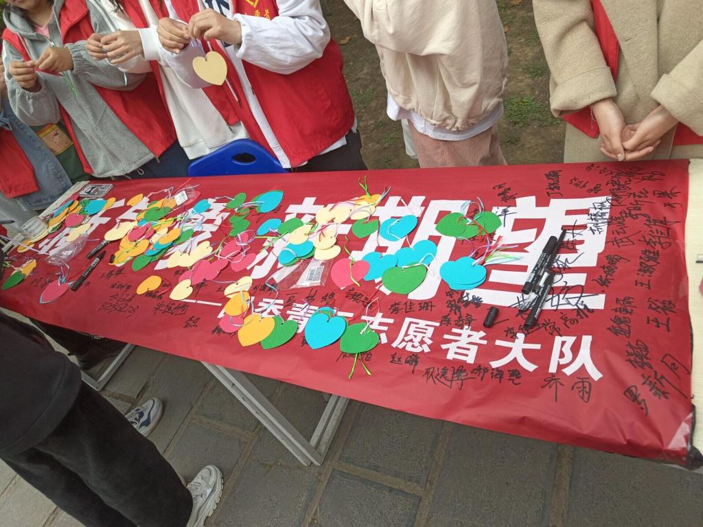 活动开始,青志大队全体干事提前准备好桌椅还有心愿卡和横幅等候着同学们的到来。活动期间,参与的同学们写下自己的心愿卡挂在2号楼门口的树上并签字。在签字过程中,在场同学们情绪高涨,认真的一笔一划的写下了自己对新学期的期望。