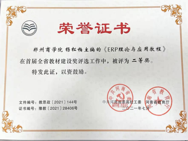 教材建设方面:科学化建设优质教学资源,确保教材建设的质量和标准,促进教学质量和人才培养质量不断提高。《ERP理论与应用教程(第二版)》立项河南省“十四五”规划教材,同时在首届全省教材建设奖评选工作中被评为“二等奖”;由任教授带头、工商专业教师参编的《公共关系学》正式出版并投入使用。
