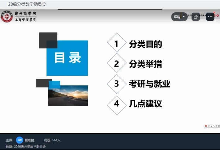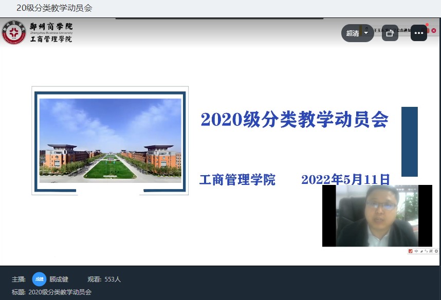 为落实校领导期初讲话精神,深化学校教育教学综合改革,持续推进分类教学实效,5月11日下午,工商管理学院召开2020级分类教学线上动员会。我院院长杨松柏、党委书记宋森、副院长张卫丽、教学秘书张瑜、全体教研室主任、2020级全体辅导员和学生参会。