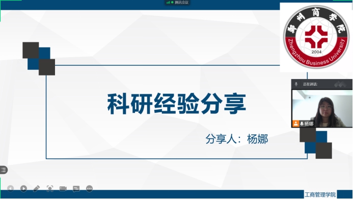 为了提高学院的教科研水平,切实解决青年师生在教科研中存在的困难,增强广大师生的科研意识,营造良好的科研氛围,鼓励青年教师和大学生积极参与到学术研究中来,工商管理学院于5月12日下午通过“线上+线下”的方式召开科研项目分享会,邀请我院青年教师杨娜和我院2020级财务管理专业学生赵晴结合自身申报项目经历进行分享,杨松柏院长、张卫丽副院长、教研室主任、青年教师及部分学生参加了本次活动。
