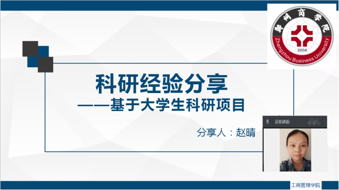 2020级财务管理专业学生赵晴结合自己2021-2022学年999策略白菜手机论坛大学生科研项目进行分享,赵晴同学以自己的向阳青年大学生文化社群及高校合作平台项目进行了展示,向阳青年文化社群通过线上线下的活动和网站内容建设对大学生思想价值进行引导,积极推动大学生树立正确的思想观、价值观,与河南省多家高等院校校领导与学生会之间沟通合作,进行线下推进,打造合作关系。赵晴同学结合自身经验,鼓励同学大胆参与学术科研,培养问题意识,将学术研究与专业学习之间相辅相成,从而实现综合素质的提升。通过分享自己的大学生科研项目,勉励其他同学在指导教师帮助下积极进行科研创新活动。