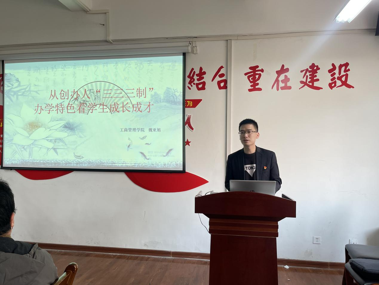 我院魏亚旭老师从创办人“三三三制”办学特色分享如何看待学生成长成才问题。他讲到:万事万物都有其运动变化发展的规律,那么对于辅导员来说掌握学生管理工作的规律,是做好学生思想政治教育的前提。我们要积极走入学生的心灵,学会倾听学生的心声和烦恼;要注意和学生交流的语言,掌握表扬和批评的艺术,使学生能够听进去,记得住,同时也要加强对学生的人文关怀和心理疏导,帮助学生健康成长成才。