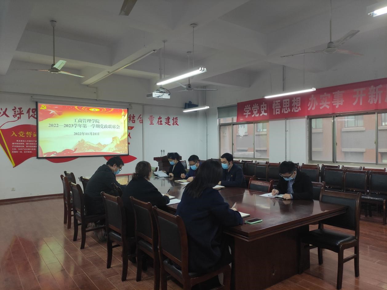 11月21日,工商学院在2号楼二楼会议室召开第十四周党政联席会。工商学院院长杨松柏、党委书记宋森、副院长张卫丽、教学秘书张瑜、团委书记魏瑶、组织委员顾成健、统战委员康俊峰、宣传委员张勤英参加会议。会议由宋森书记主持。