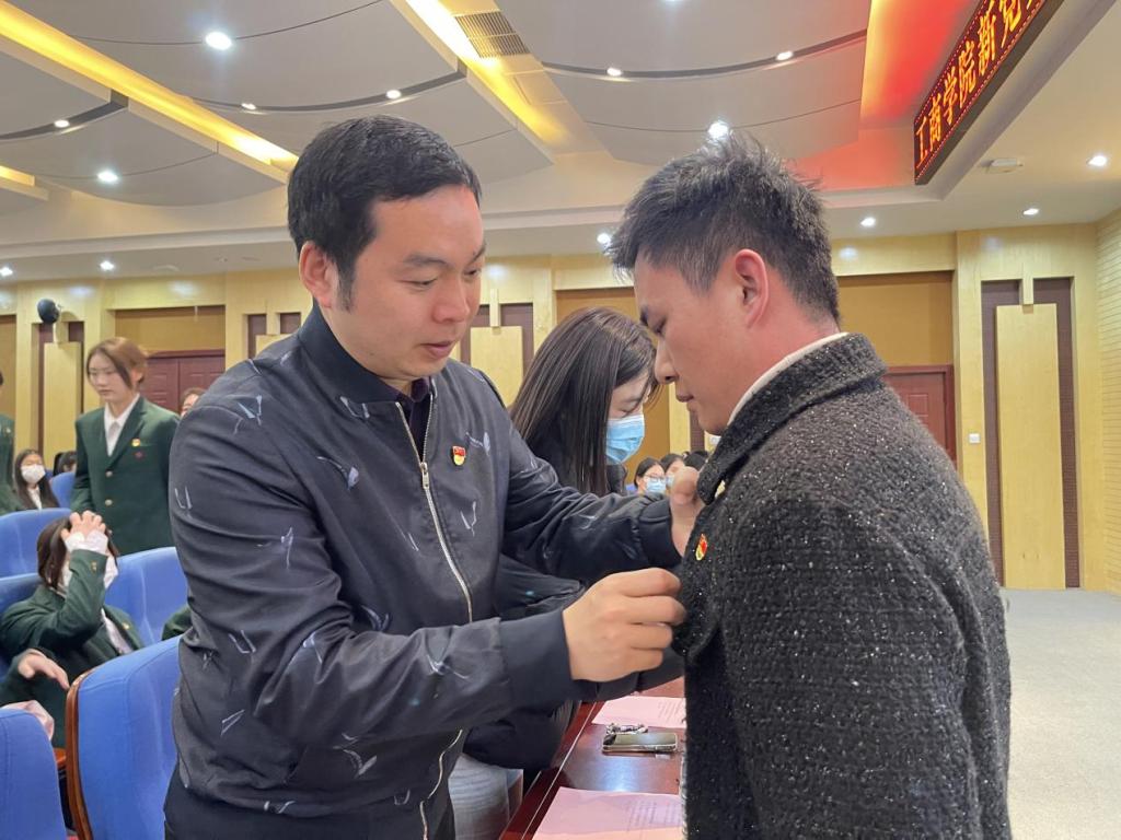 接着,仪式进行第三项,由我院领导、老师为新党员代表佩戴党员党徽。党徽配胸前、使命记心间。