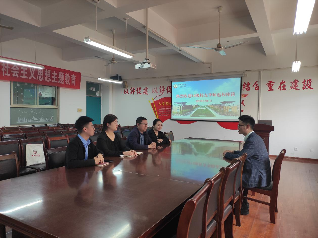 为了进一步加强校友与母校的联系,促进母校与校友的沟通,发挥“朋辈教育”的示范引领作用,我院于5月11日下午在2号教学楼会议室开展校友交流座谈会,邀请2014级校友李帅返校,我院杨松柏院长、团委魏瑶书记、招生就业处徐晔老师、就业专员张逸凡老师参会。