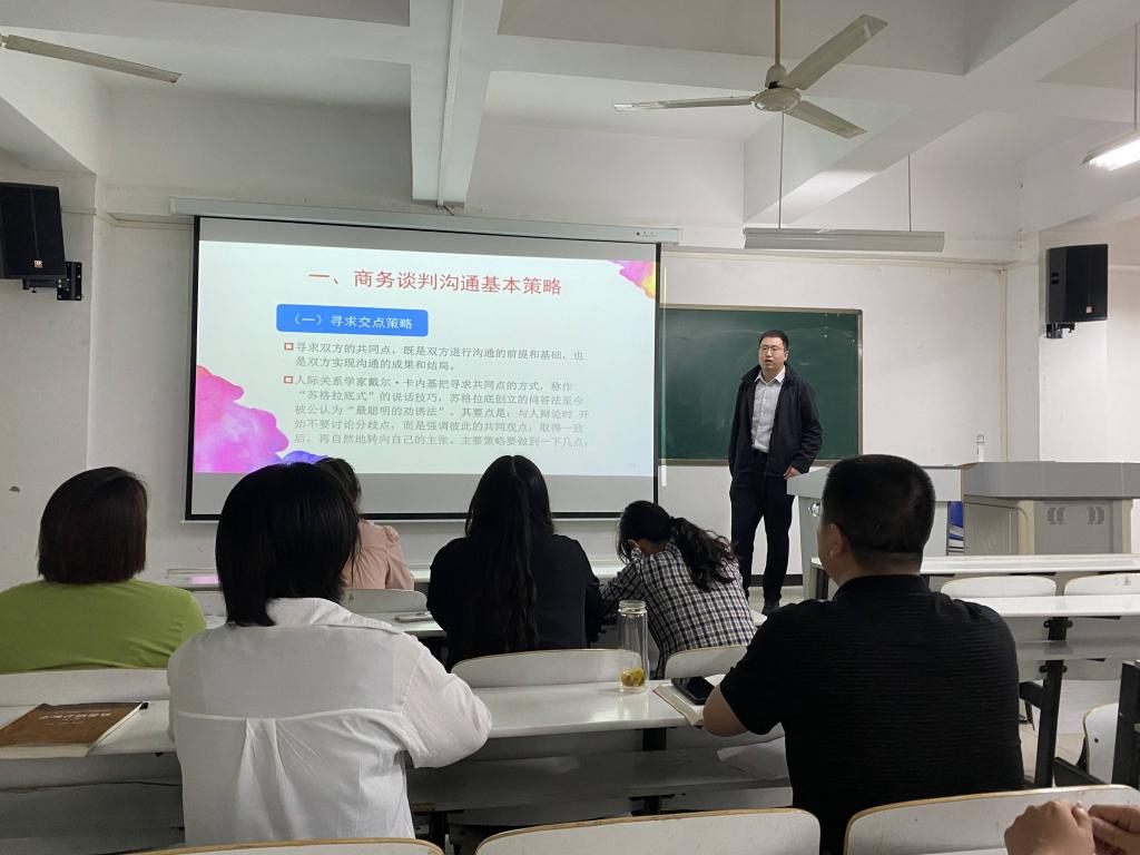 首先,新入职的青年专任教师费城钰,许林鹏老师根据目前市场营销核心专业课程商务谈判的相关课程进度和教学要求分别进行了25分钟左右的试讲,主要从课堂ppt展示、上节课程内容回顾、章节展示、课堂互动等多个角度进行演示。