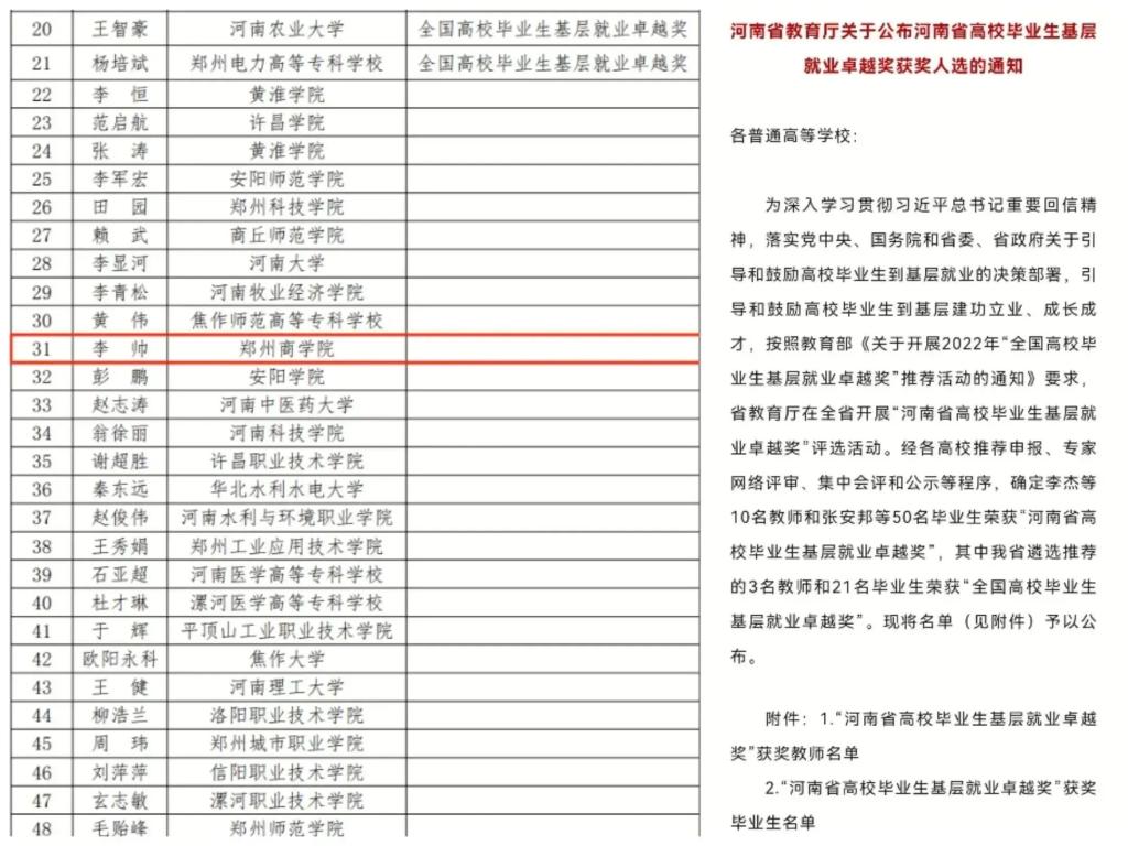 根据《河南省教育厅办公室关于开展“河南省高校毕业生基层就业卓越奖”评选活动的通知》(教办学〔2023〕40号)要求,我校积极收集整理,推荐符合条件的优秀校友参选。经过省专家网络评审、集中会评等程序,评选出“河南省高校毕业生基层就业卓越奖”高校毕业生50人,工商管理学院14级财务管理专业李帅校友荣获此奖项!