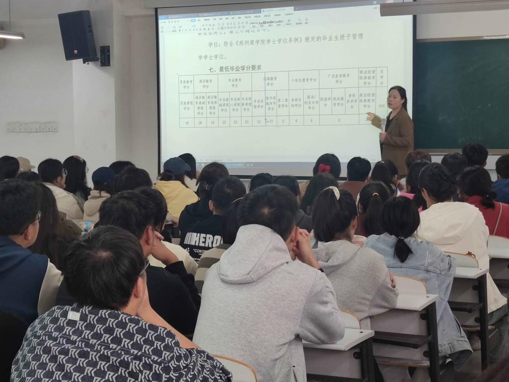 市场营销教研室主任张玲燕随后为新生讲解我校的发展历史、专业特色,详细解读了市场营销专业的培养方案,包括课程体系设置、毕业学分要求和选课指导等内容,让学生深入了解我校市场营销专业课程设置既重视专业基础理论和实践能力的培养,同时能满足学生专业个性化学习需要。