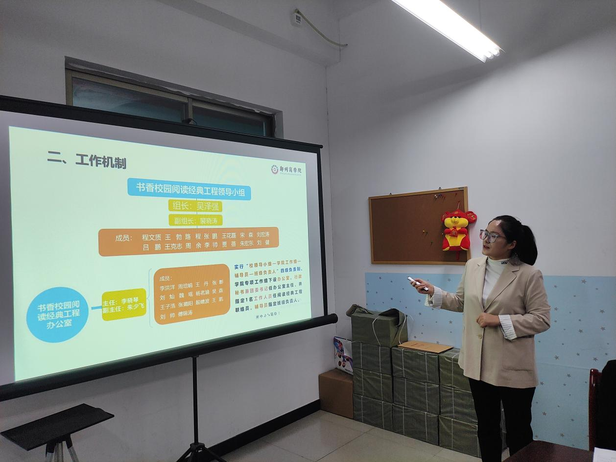 会上,刘老师并从“以品牌活动强化阅读引领、以学分修读推进阅读意识形成、加强阵地建设构建阅读平台”等三个方面为大家全面解读了书香阅读经典工程实施方案具体内容。希望辅导员老师们严格按照“学生主体、教师参与”的工作思路和“内容充实、鼓励创新”的工作要求,积极引导学生践行“读书生活化、学习终身化”的学习理念,多措并举开展系列活动,不断丰富学生的精神生活,优化校园文化环境,促进学生综合素质的全面发展。