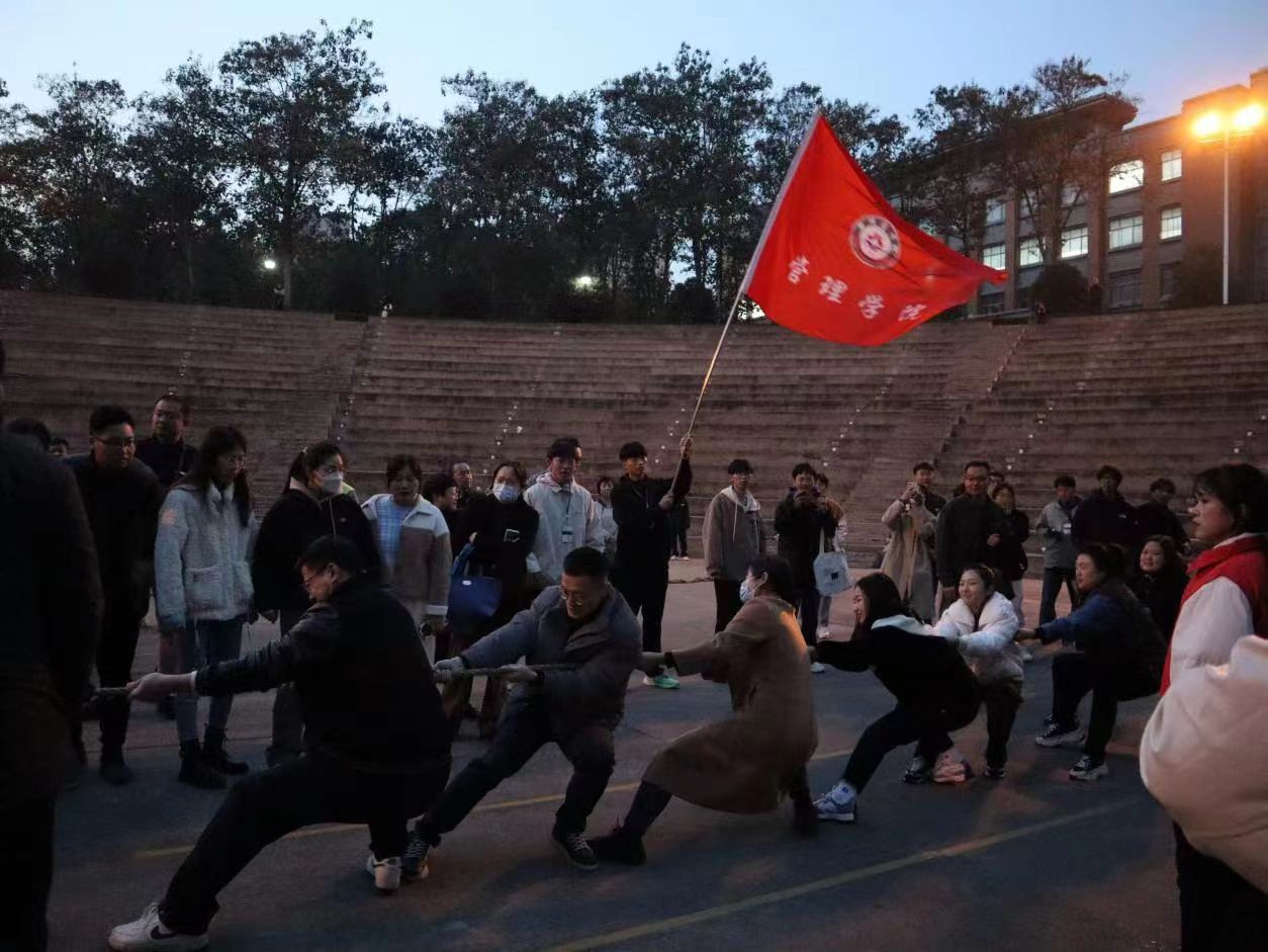 拔河比赛在艺文广场如火如荼的进行。随着裁判一声哨响,比赛开始,院旗飘扬,加油声震耳欲聋,参加比赛的老师们、同学们,双脚一前一后,身体向后倾斜,奋力向后拉,口中喊着“一二一”的口号。最后我院教工组在拔河比赛中取得了第三名的好成绩。