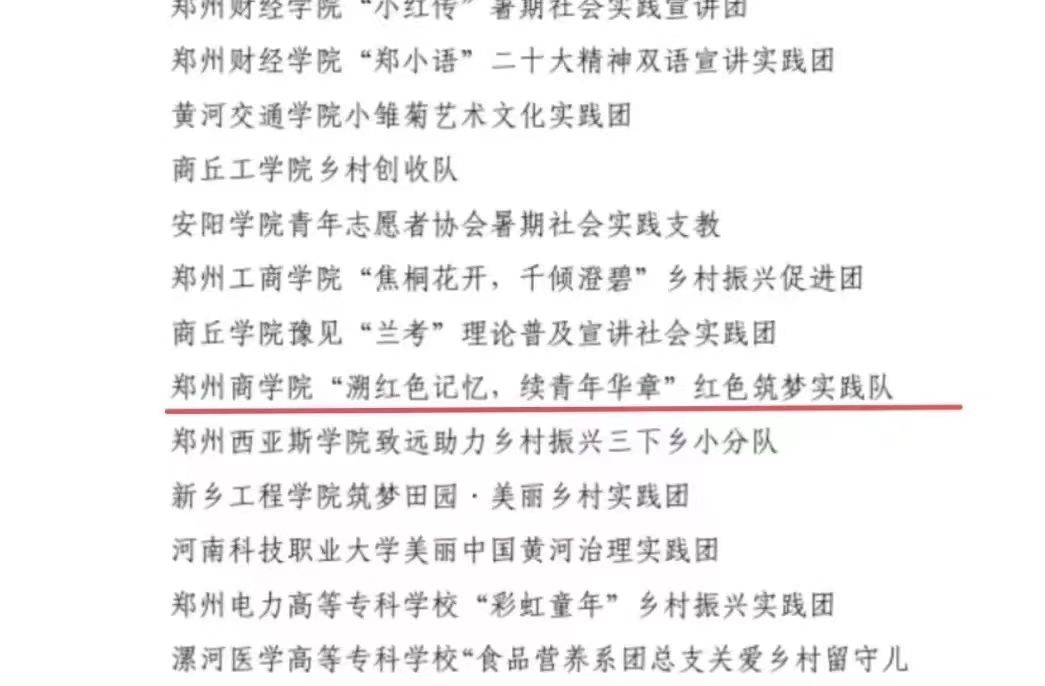为深入总结交流经验,选树典型宣传,推动引领示范,激励广泛参与,发挥育人实效,河南省委宣传部、省教育厅、团省委、省学联联合下发的《关于2023学年全省大中专学生志愿者暑期文化科技卫生“三下乡”社会实践活动的通报》(豫青联字[2023]42号),对在2023年“三下乡”社会实践活动中表现突出的优秀集体、个人和项目进行通报表扬。管理学院“溯红色记忆,续青年华章”红色筑梦实践队荣获“优秀实践团队”荣誉称号。