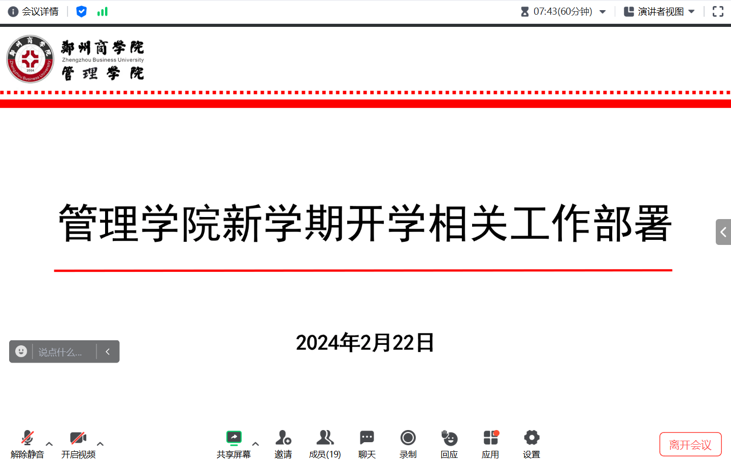 为做好新学期各项工作部署,开好局,起好步,共聚新力量,共谋新发展,共赴新征程,2月22日下午,我院在腾讯会议召开新学期收心暨工作部署会。我院党委书记宋森、团委书记魏瑶及全体辅导员参加会议。