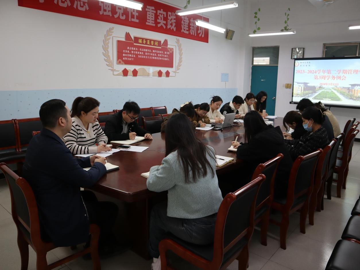3月12日,管理学院在2号楼二楼会议室会议室召开2023-2024学年第二学期第三周学务例会,管理学院党委书记宋森、团委书记魏瑶及全体辅导员参加会议。