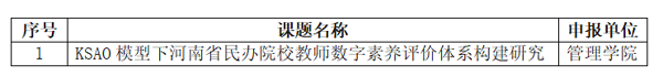 根据我校《关于组织申报河南省教育科学规划2024年度一般课题的通知》要求,经前期精心组织,广泛动员,经我院学术委员会评审后,拟推荐1项申报书作为我院2024年度河南省教育科学规划一般课题最终提交材料,名单如下: