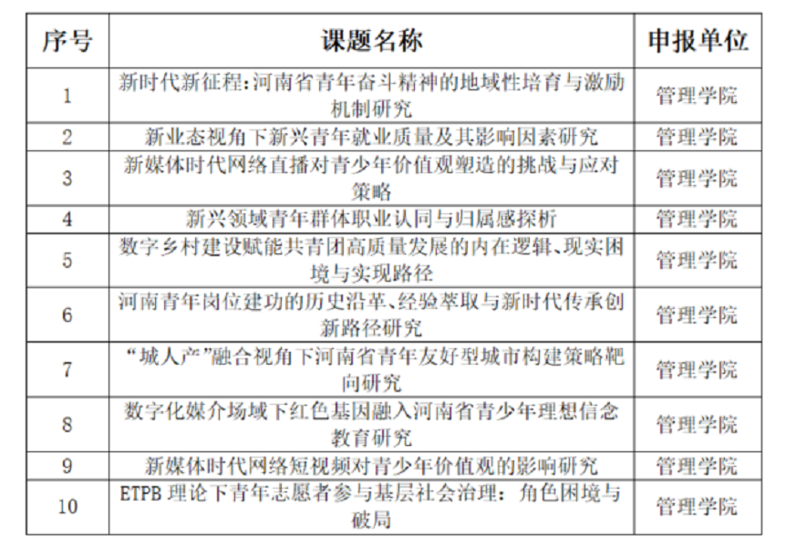 根据我校《关于组织申报2024年度专项调研课题(青少年工作研究)的通知》要求,经前期精心组织,广泛动员,管理学院共收到11项申报书。经我院学术委员会评审后,拟推荐10项申报书作为我院2024年度专项调研课题(青少年工作研究)最终提交材料,名单如下:
