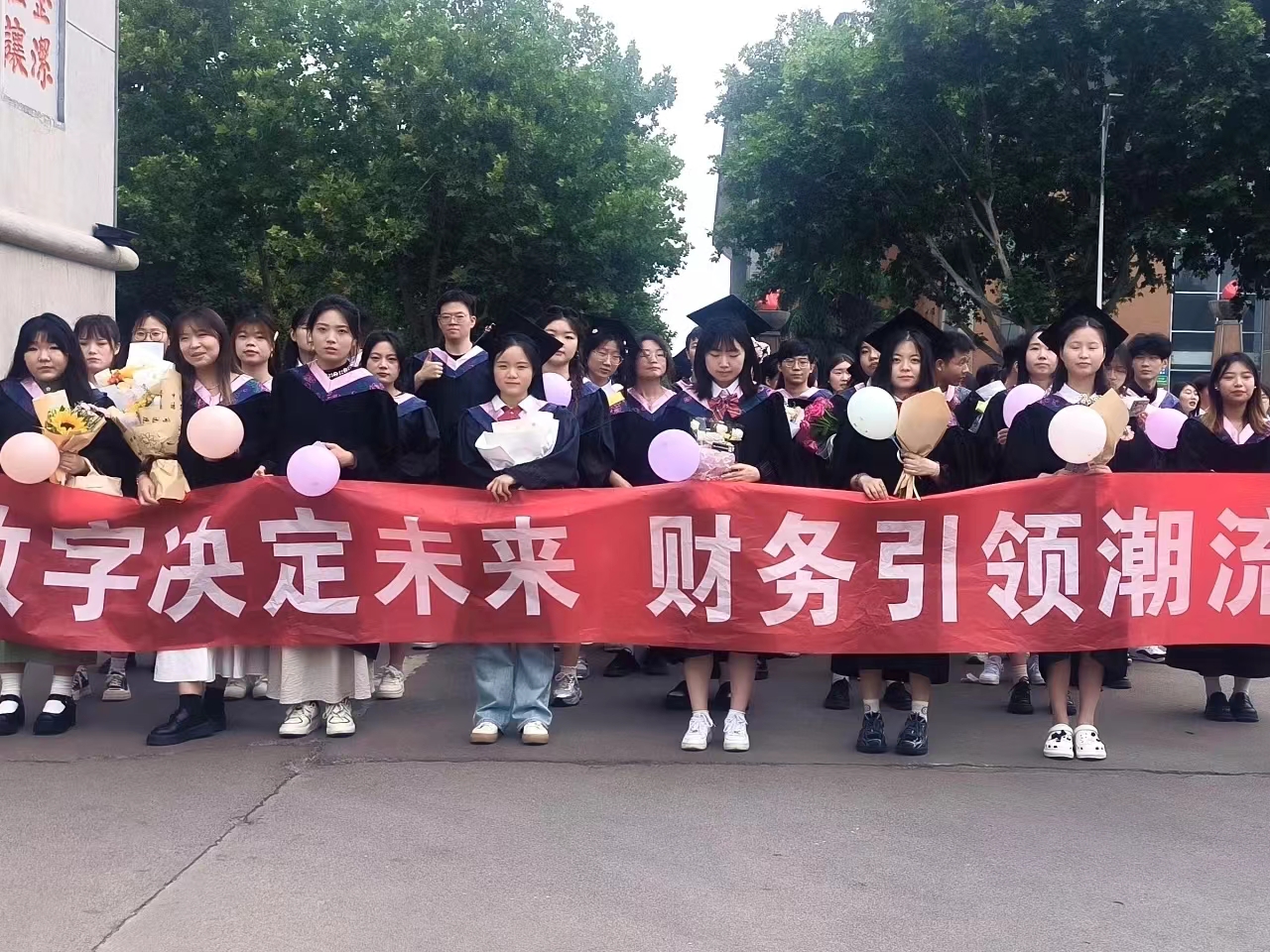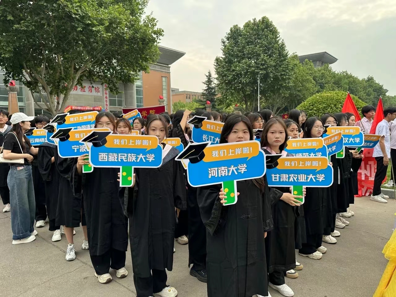 学弟学妹们带着各式的标语、手卡、鲜花、礼物,有秩序地分列在巡礼路线两侧,为学长学姐们送上祝福;毕业生们与师长、同学们挥手告别,相互祝福,再一次行走在郑商校园里。