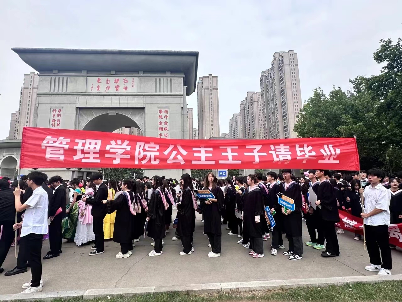 学院门口放置以管理学院全体毕业生姓名组成的“我爱管理”喷绘;电子屏播出“祝2024届毕业生毕业快乐”定制的“怀梦想,致远方”“主打一个快乐毕业”等KT板,各种美好的祝愿条幅在观礼区域飘扬,气球、卡纸、加油棒等道具更渲染出一种毕业的氛围。