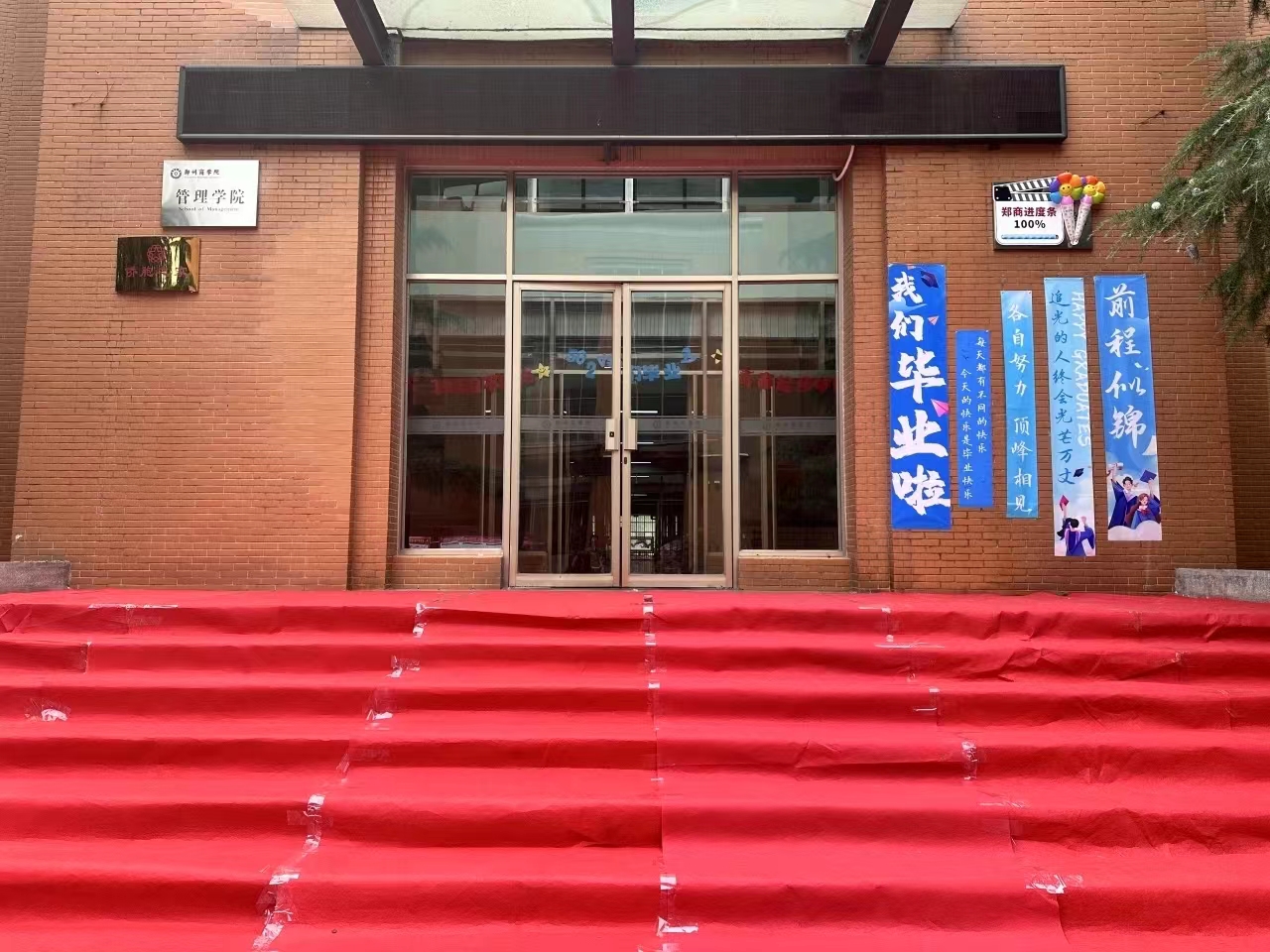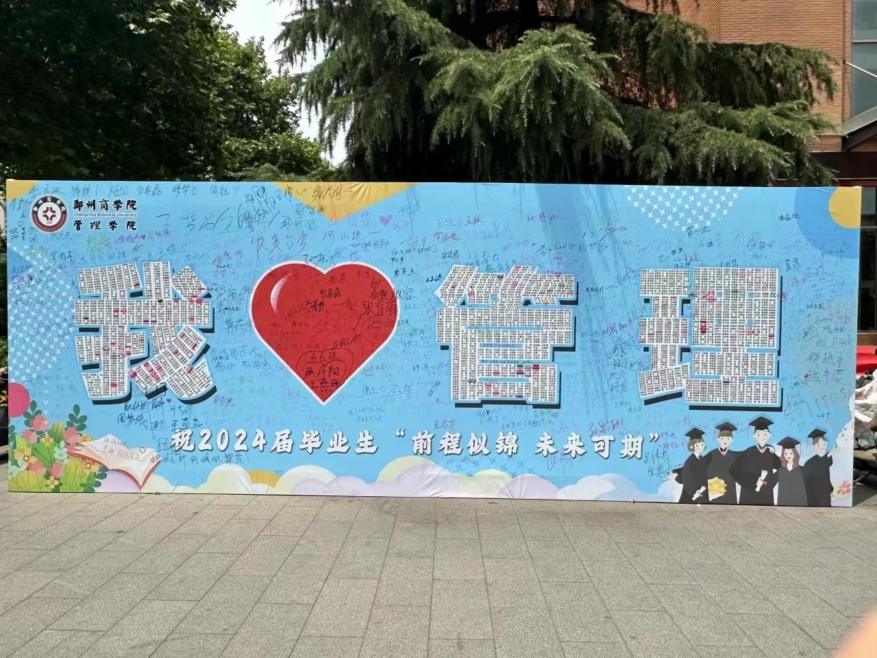 学院门口放置以管理学院全体毕业生姓名组成的“我爱管理”喷绘;电子屏播出“祝2024届毕业生毕业快乐”定制的“怀梦想,致远方”“主打一个快乐毕业”等KT板,各种美好的祝愿条幅在观礼区域飘扬,气球、卡纸、加油棒等道具更渲染出一种毕业的氛围。