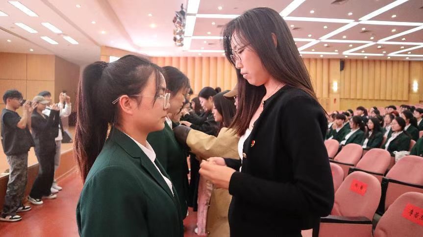 接着,管理学院领导、老师为新党员代表佩戴党员党徽,党徽在胸前熠熠生辉,诉说着党的光辉历史和伟大使命。新党员们目光坚定,他们感受到了党徽所承载的重量和意义。这枚小小的党徽,象征着中国共产党的领导,象征着光荣与责任。