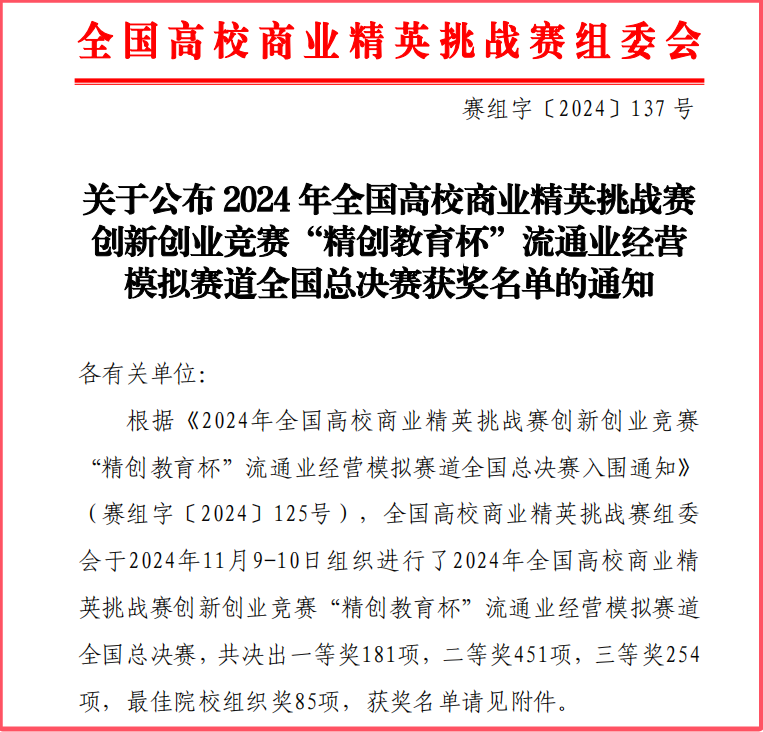 11月13日,由中国贸促会商业行业委员会、中国国际商会商业行业商会、中国商业经济学会主办的2024年全国高校商业精英挑战赛创新创业竞赛流通业经营模拟赛道全国总决赛圆满落幕。经过知识赛、校赛、区域赛的激烈角逐,我院由工商管理、市场营销等专业学生组成的九支代表队,在指导老师张玲燕、陈茜、吴阳阳、宁卫杰的带领下,取得国赛一等奖2项、二等奖5项、三等奖2项的优异成绩,我校荣获最佳院校组织奖。