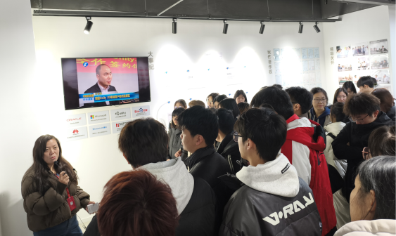在河南电子商务产业园区,全体同学参观了园区龙头企业---河南云和数据信息技术有限公司,在公司办公区、技术体验中心等区域,了解了公司的发展、校企合作成果以及公司“云和教育、云和技术、云和服务和云和国际”四大事业部。随后,在会议室,公司领导为学生做了精彩的报告,为学生们介绍了互联网的发展历程以及岗位知识图谱,通过实际案例为学生解析了项目产品的开发过程,并介绍了人工智能领域的发展前景以及专业学习方法。