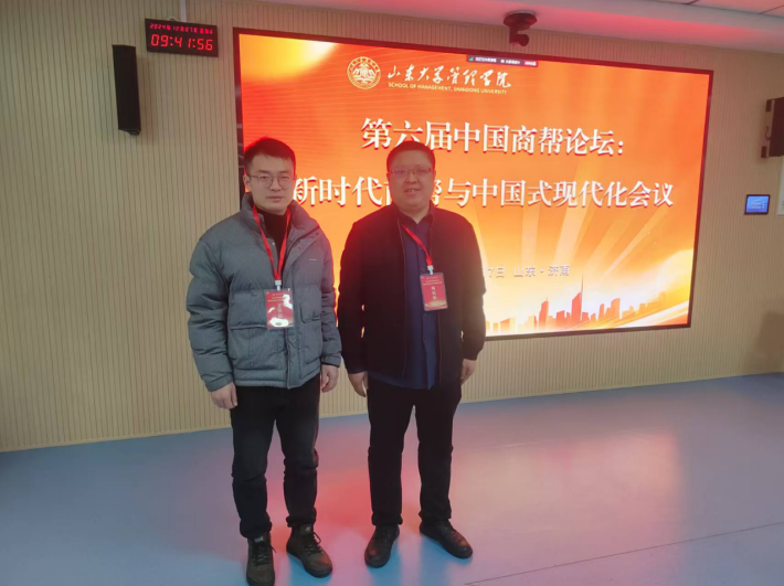 2024年12月6日-7日由中国商业史学会、中国商帮论坛主办,山东大学管理学院承办的第六届中国商帮论坛——“新时代商帮与中国式现代化”在山东大学成功召开。为进一步推动我院《国学管理思想》课程及校本教材建设,提升教师在弘扬中国优秀商业文化,赋能新时代中国企业实现创新驱动的高质量发展,学院杨松柏、王佳起两位教师参会学习交流。应大会组委会邀请,我校省“十四五”规划申报教材《国学管理思想》主编杨松柏老师,于大会做《豫商文化在奋力谱写中国式现代化河南实践中“豫”见未来》主题发言。