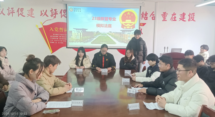 为了有效地践行OBE教育理念,使《旅游法规》教学内容更加生动、直观,加深学生对法律知识的理解和应用,我院旅管专业组织2023级专业学生开展模拟法庭活动。12月13日上午,管理学院院长李晓翠、教研室主任王彦青、任焕琴教授、任课教师李国谨、教研室其他老师以及2023级学生出席了此次活动。