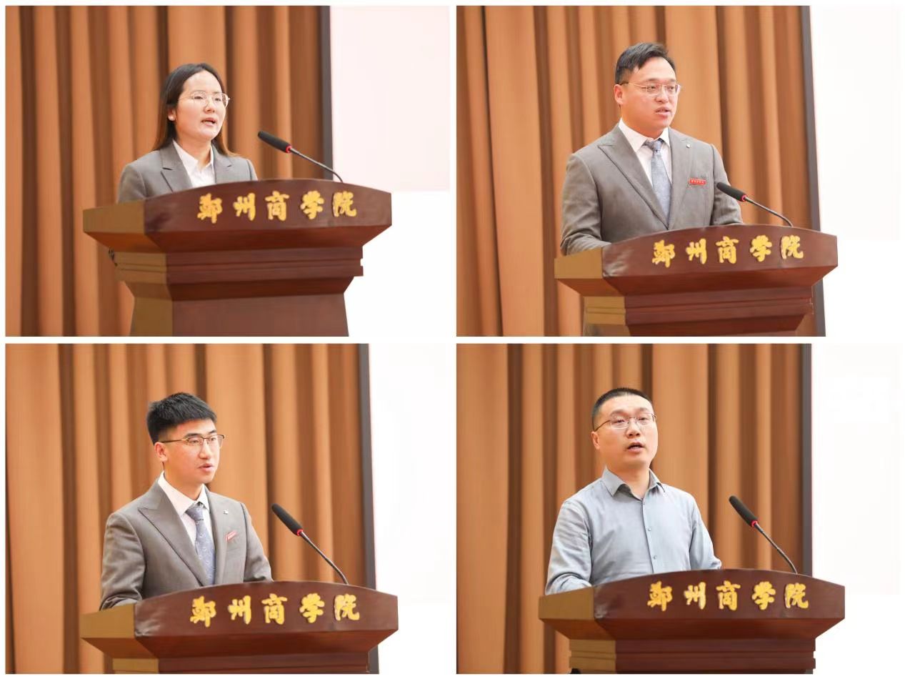 考研指导优秀导师代表贾娇,科研先进个人代表李明哲,就业工作先进个人代表张逸凡,中联企业管理集团有限公司总经理赵飞鹏,分别围绕教学工作、科研工作、就业工作、校企合作的体会与感想作了交流发言。