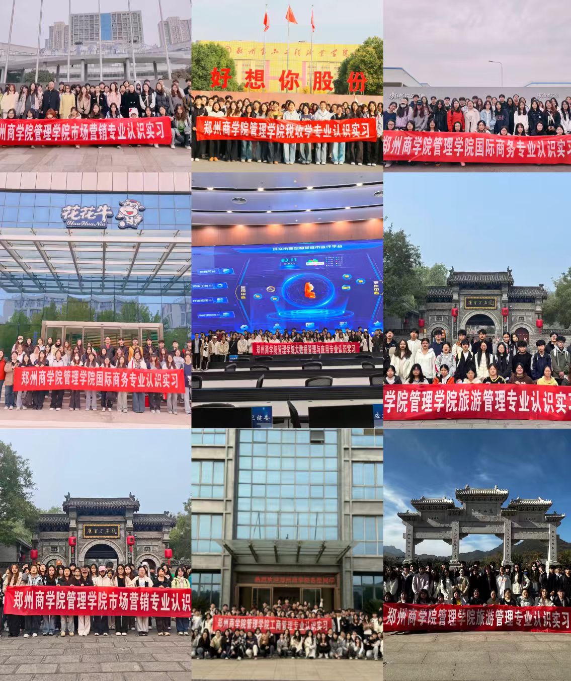 第三模块:企业访学,衔接产业实际。各专业负责人根据专业特色积极联系相关企业,并组织学生到企业进行参观学习。此次实习活动参观的企业有人民电缆集团有限公司、河南省电子商务产业园河南云和数据信息技术有限公司、河南花花牛乳业集团股份有限公司、郑州顶津食品有限公司、康百万庄园、少林寺景区、郑州好想你股份有限公司、巩义市委智慧城市运行办公室新型智慧城市运行中心。通过实地参观生产流程、参与部门交流,学生直观了解企业运营模式与管理实践,建立起专业知识与产业应用的直观连接。企业观摩结束后,各专业指导教师安排学生与企业员工进行面对面交流,了解企业员工的职业经历、工作心得,了解不同行业、不同企业的运营模式和管理理念,将课堂理论与企业实战无缝链接,极大地拓宽了学生的专业视野,为未来的专业学习与职业发展奠定了坚实的基础。