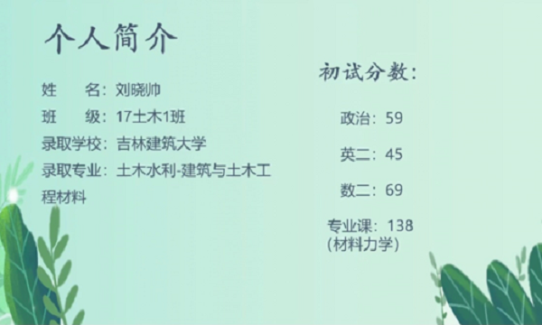 为进一步加强同学们对研究生入学考试的认识,了解前沿的就业形势、增强考研斗志,建工学院于3月24日邀请就读于吉林建筑大学的2017级毕业生刘晓帅为主讲,为同学们分享他的考研经历,讲座在晚上七点在腾讯会议进行。