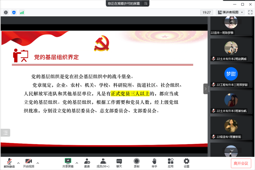 为加强对入党积极分子的培训工作,进一步提高入党积极分子的党的基础理论素养。10月29日,建筑工程学院第三十五期业余党校党课第三讲线上召开,此次培训由辅导员许可老师以“党的组织、纪律和作风”为题授课。