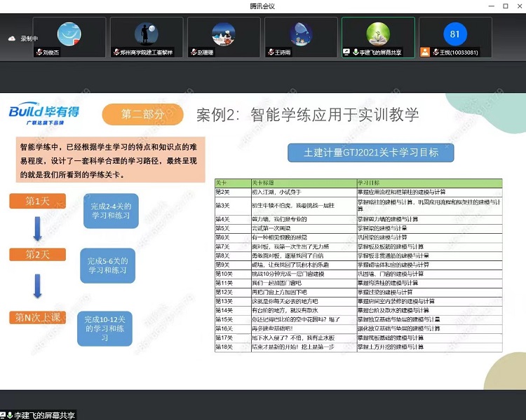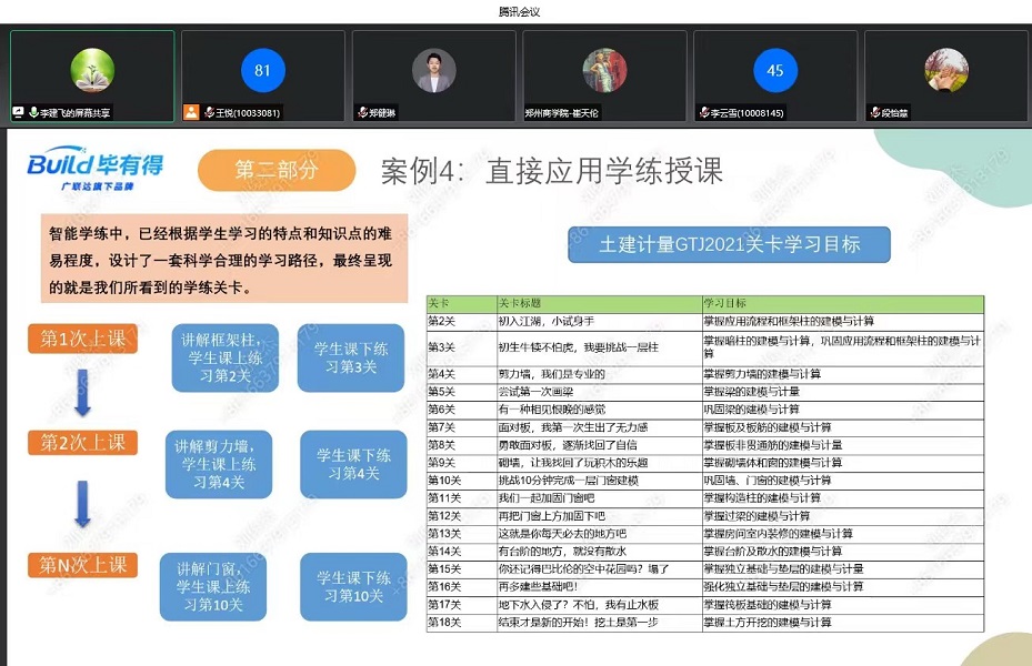 本次培训在腾讯会议采取线上培训的形式。培训主要包括八部分内容:智能学练的内涵和意义;智能学练与实训课程的对应关系;智能学练如何与教学相结合;智能学练的三大核心价值;智能学练的教学结合方案;如何应用智能学练辅助课下学习;如何应用智能学练备考备赛;智能学练的应用案例。培训结束后,广联达企业的负责人与我院教师关于实训教学方面进行了探讨。