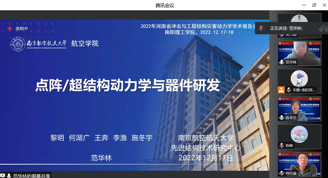 本次学术报告会议由河南省力学学会主办,河南省冲击与工程结构灾害动力学国际联合实验室承办。在南阳理工学院会议中心举行,采用线下和线上相结合的方式举行。会议首先由南阳理工学院校领导与河南省力学学会秘书长、我院院长孙利民教授分别致辞,随后由15位专家分别作会议主旨报告、邀请报告、青年学者报告。会议主要内容包括冲击吸能结构的创新设计、冲击动力学的实验和数值模拟进展、地质灾害动力学、材料动力学行为的实验与表征等。