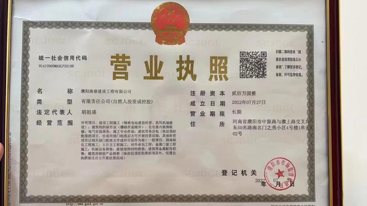 胡祖盛从刚上大学时就对创业有浓厚的兴趣,他利用课余时间积极锻炼自己,学习关于专业以及创业的相关知识,进入行业内充分了解和吸收相关的运作方式,于在2022年07月27日创办了濮阳深睿建设工程有限公司,为以后的专业知识的实践做好准备。该公司主要经营范围包括许可项目为建设工程施工、建筑物拆除作业、住宅室内装饰装修等,持有建筑工程施工总承包三级资质。