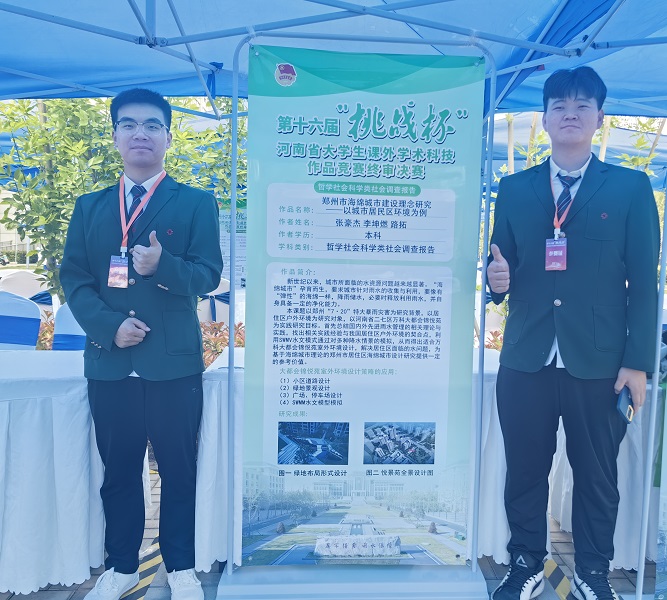 第十六届“挑战杯”河南省大学生课外学术科技作品终审决赛在华北水利水电大学举行,我院20道桥1班学生张豪杰等同学所送报的作品“郑州市海绵城市建设理念研究——以城市居民区环境为例”,经过河南省赛区评委的严格评选,从近2万件参赛作品中脱颖而出,进入终审决赛。我院2位参赛队员在学院团委书记刘帅老师、校团委李静静老师和作品指导教师王素萍老师的带领下,于5月11日-5月14日前往华北水利水电大学新校区参加终审决赛。