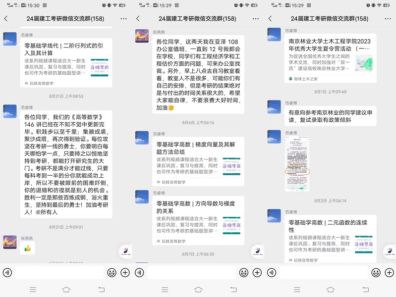 二是全心做好学生课程辅导及心理疏导。学院于6月25日至7月13日期间,集中安排了《材料力学》和《结构力学》考研专业课辅导,辅导课时累计56课时,参与学生90余人。学院建立2024届考研学生联络群,为学生每日推送考研数学难点讲解及备考技巧视频,累计130余条,帮助学生提高复习备考效率。考研班主任与辅导员老师每周与部分学生保持不间断联络,随时关注学生心理动态,及时鼓励疏导不良情绪,为学生考研复习保驾护航。
