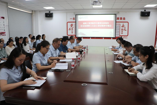 为深入学习2023-2024学年董事长、校领导在全体教职工大会的讲话精神,进一步明确新学期工作重点,不断提升工作水平和育人成效。9月14日下午,建工学院组织召开学习董事长、校领导2023-2024学年全体教职工大会讲话精神专题会议,校长助理兼工会主席张江涛副教授出席本次会议,院长孙利民、党委书记朱宏东、副院长张燕燕、行政秘书兼团委书记刘帅、教学秘书郑丹及全体教师辅导员参加会议。会议由朱宏东书记主持。