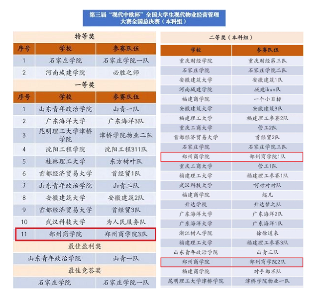 11月4日,我院工程管理、工程造价专业学生参加了第三届“现代中欧杯”全国大学生现代物业经营管理大赛全国总决赛,并且获得一等奖1项、二等奖2项的好成绩。